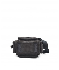 an adjustable and removable webbing shoulder strap, it offers different