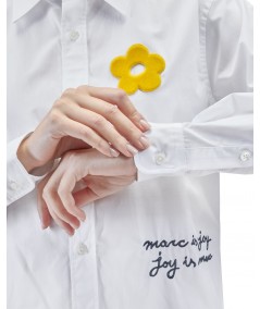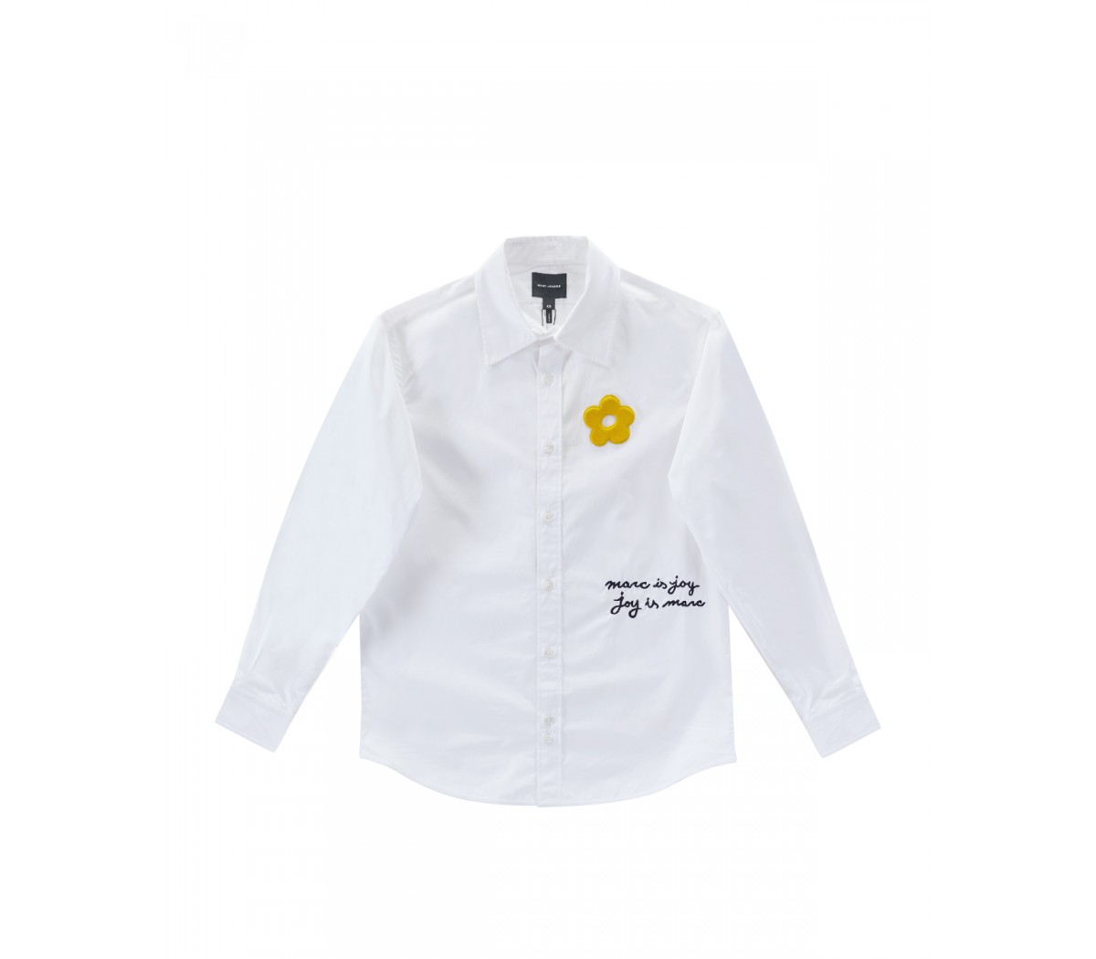 the embroidered slogan “Marc is joy” and a daisy patch.
