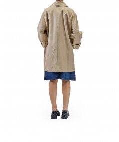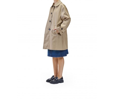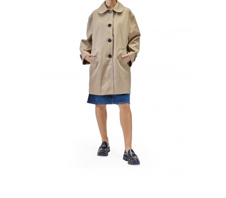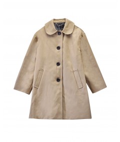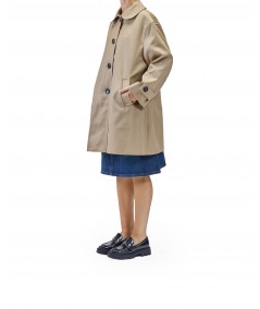 featuring a Peter Pan collar, contrast buttons and two side pockets.