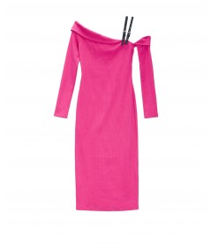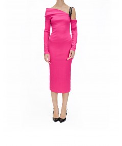Abito midi a maniche lunghe di Versace lavorato a costine con spalle scoperte, impreziosito da 2 cinturini a contrasto con fibbia che fanno da spallina